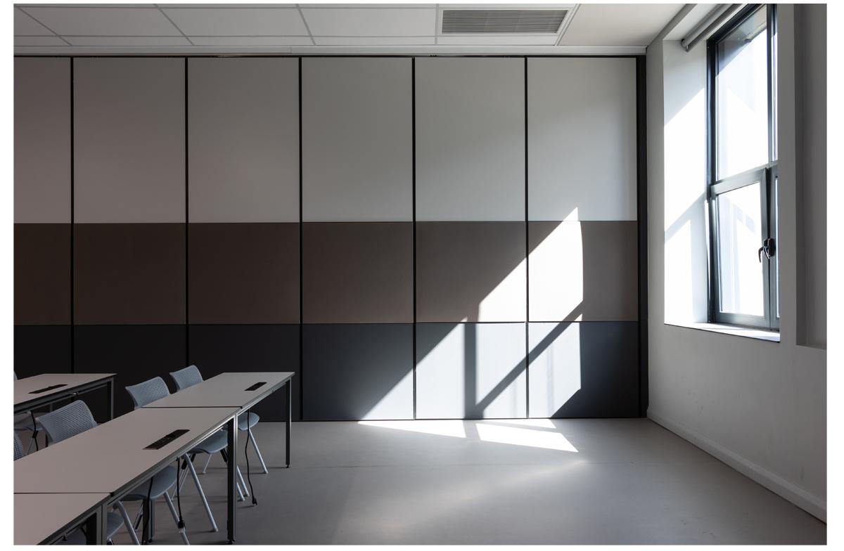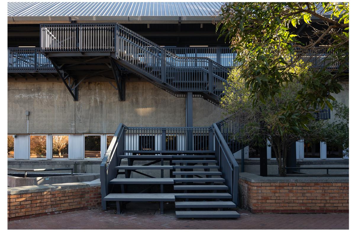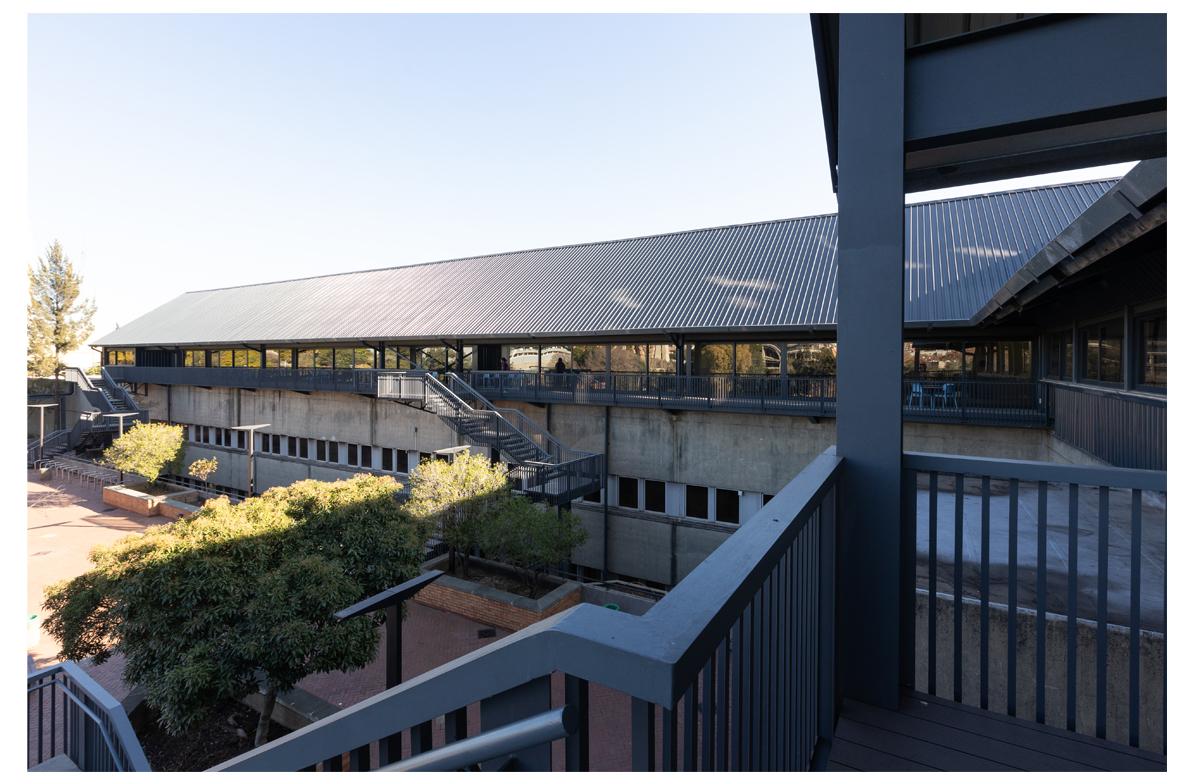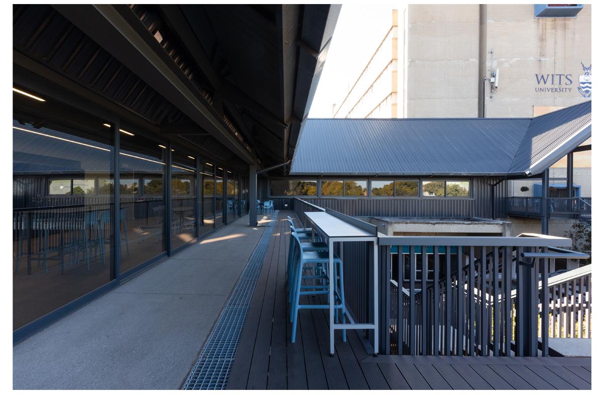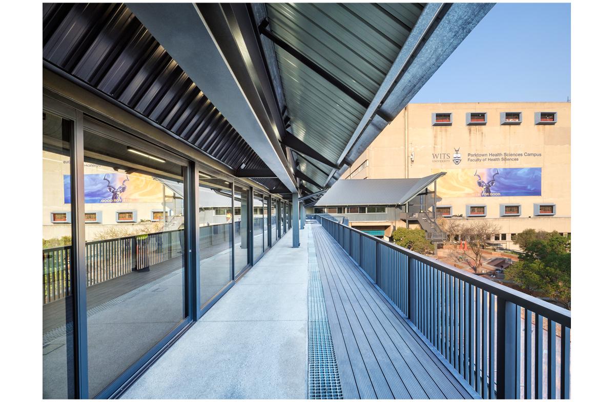 The project is an undergraduate and student focussed development of study rooms and large classrooms that have ta flexibility of configuration. Stacking wall panels allow the space to open into one large exam venue. The medical campus is constrained and lacks open ‘green’ space. The project is constructed as a lightweight structure on an existing roof and frames the existing patch of outdoor space into a courtyard. The framing is reinforced by cantilevered balconies and a glazed concourse with views of the Johannesburg skyline.
