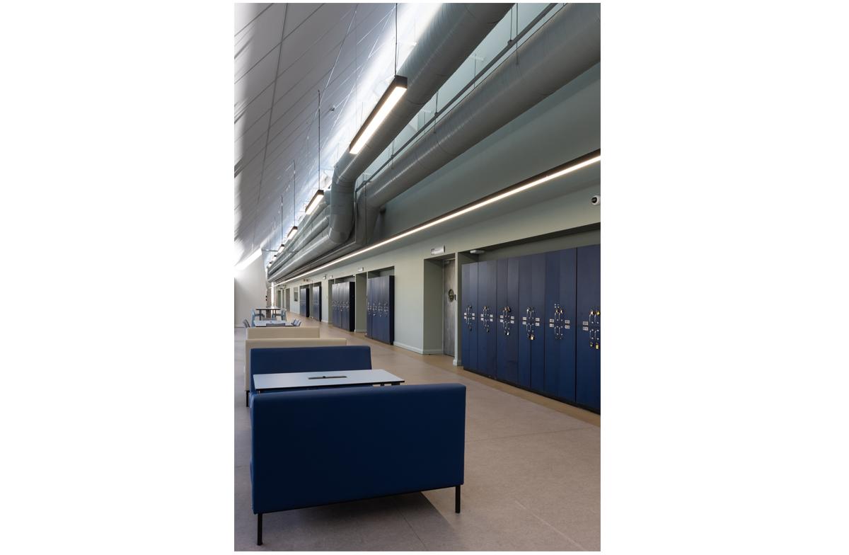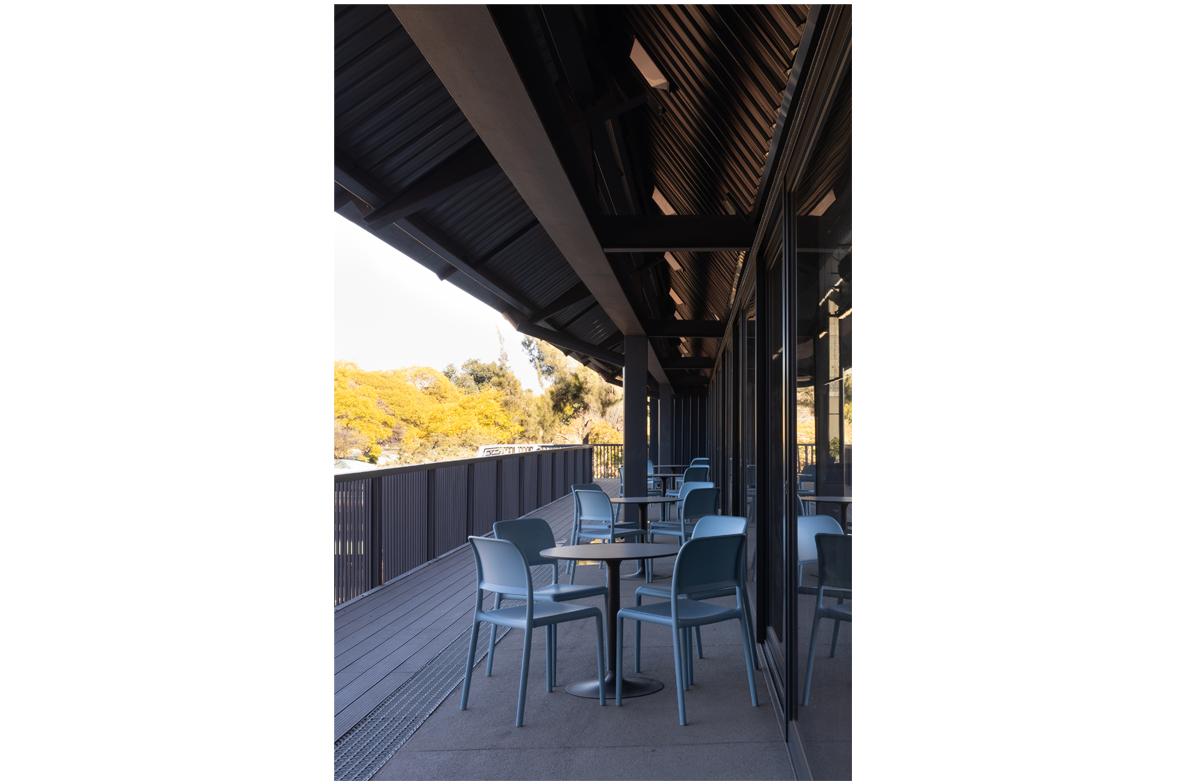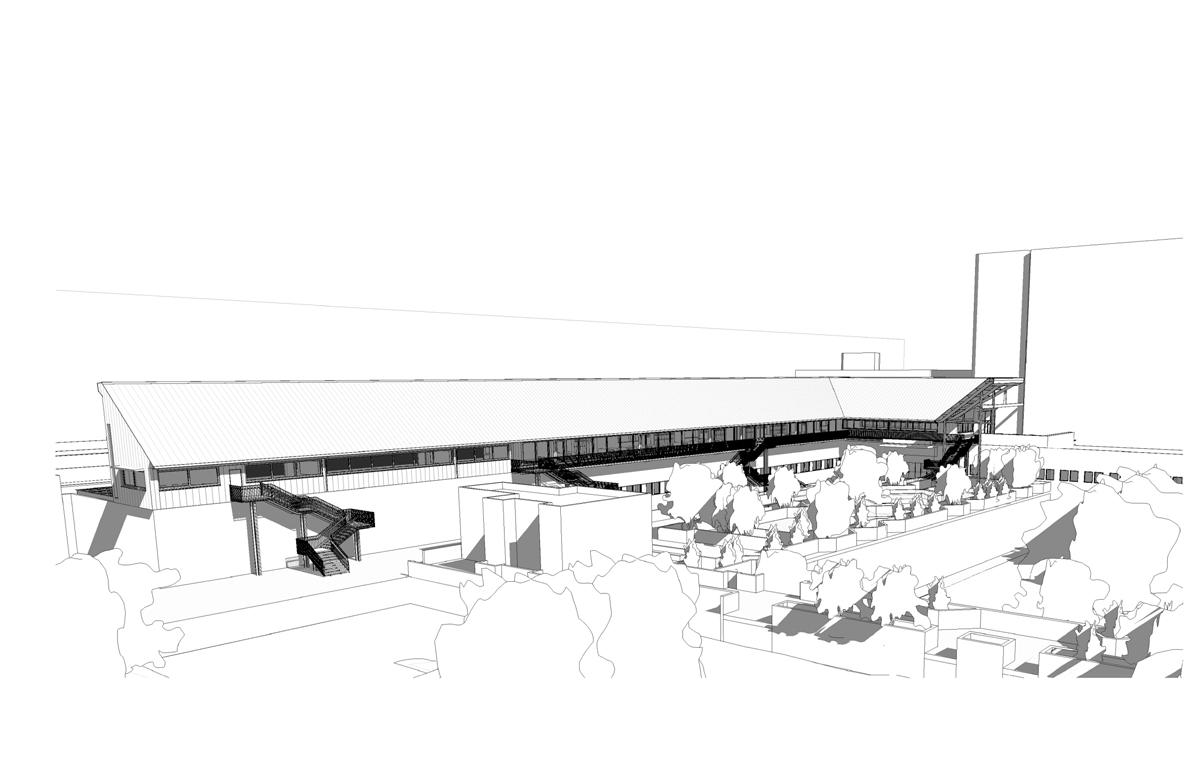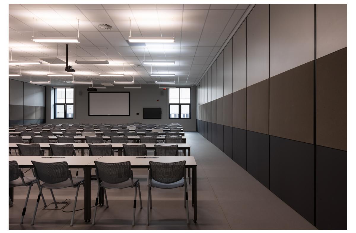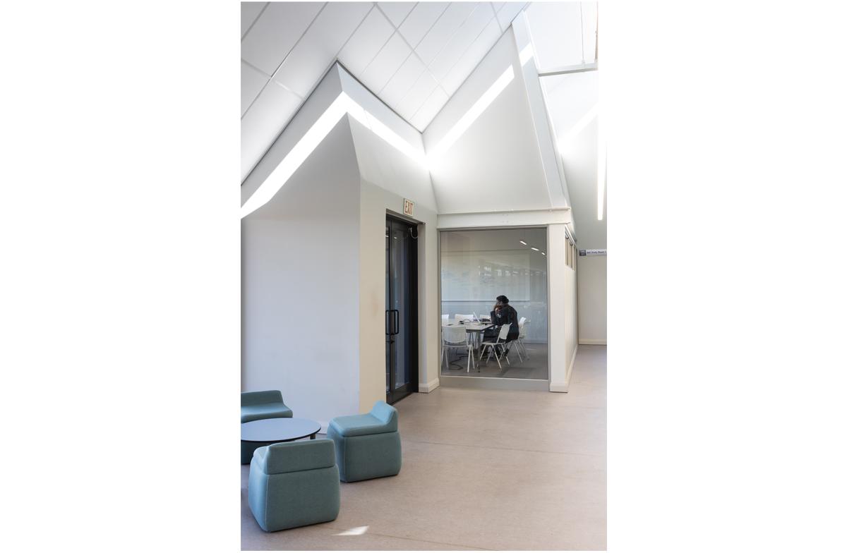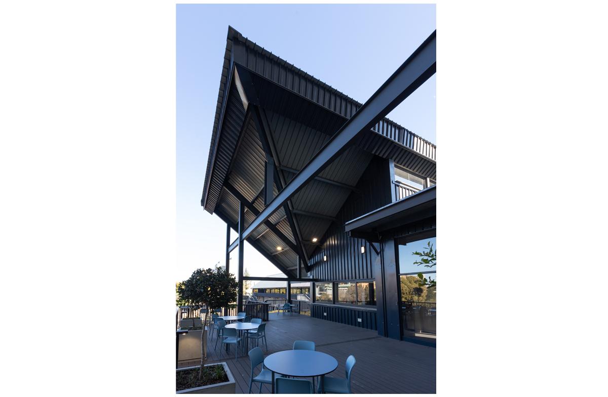 The project is an undergraduate and student focussed development of study rooms and large classrooms that have ta flexibility of configuration. Stacking wall panels allow the space to open into one large exam venue. The medical campus is constrained and lacks open ‘green’ space. The project is constructed as a lightweight structure on an existing roof and frames the existing patch of outdoor space into a courtyard. The framing is reinforced by cantilevered balconies and a glazed concourse with views of the Johannesburg skyline.